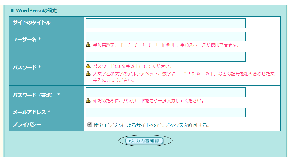 ※「ユーザー名」や「パスワード」は慎重に決めてください。サイト名から簡単に推測できるユーザー名やパスワードであると、サイト乗っ取りなどの危険性が高まります。