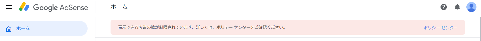 現在、 AdSenseの画面を開くと、このようなメッセージが表示されています。
