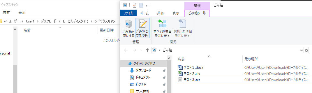このあと実験で復元したファイルをもう一度削除し、ゴミ箱に入れてみました。